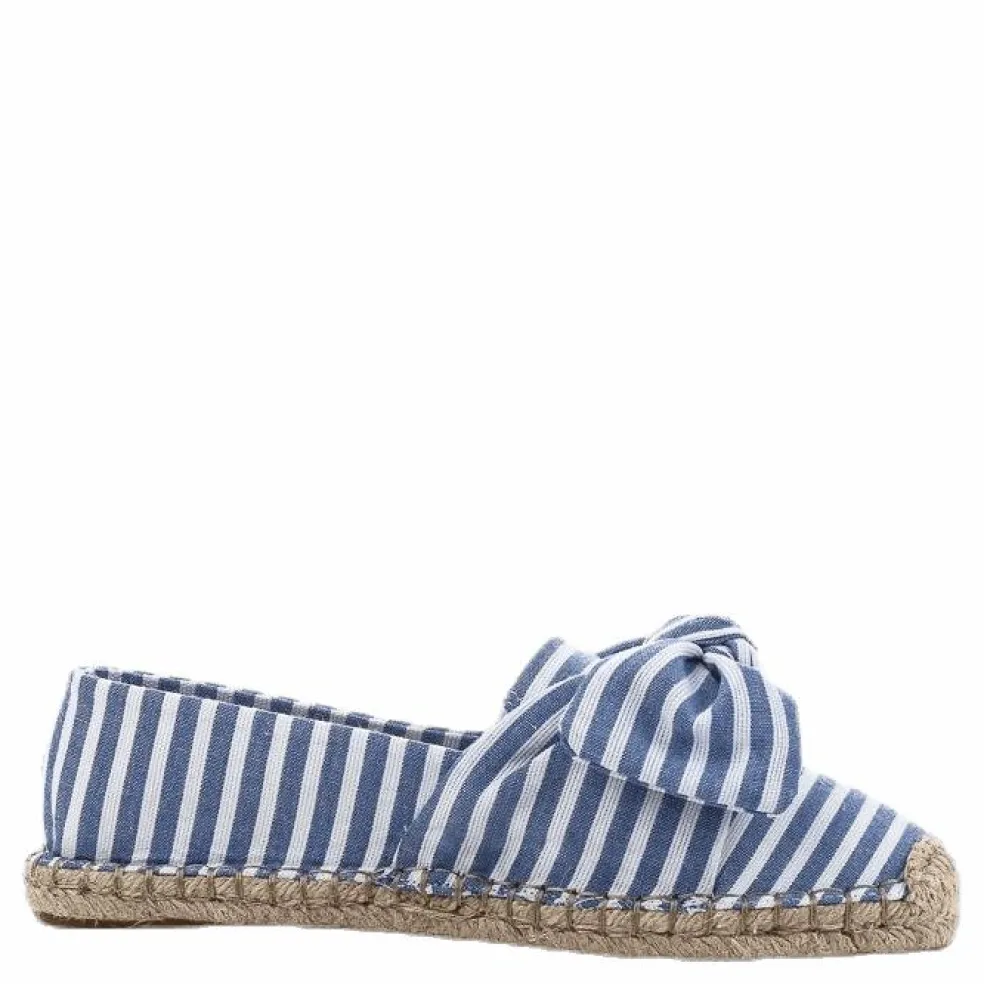 Espandrillos med yttermaterial i randig textil och sula i jute och gummi. Stor rosett mitt fram på ovandelen och liten svea logga på sidan.