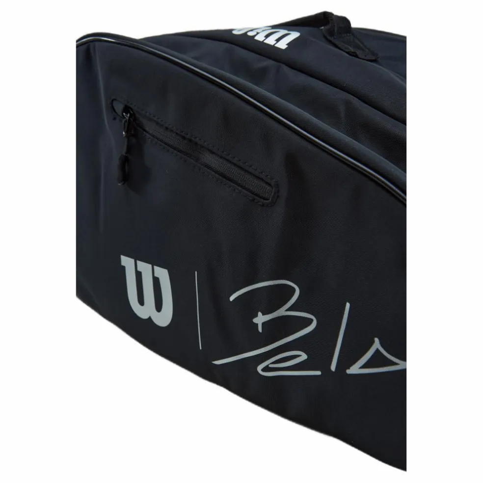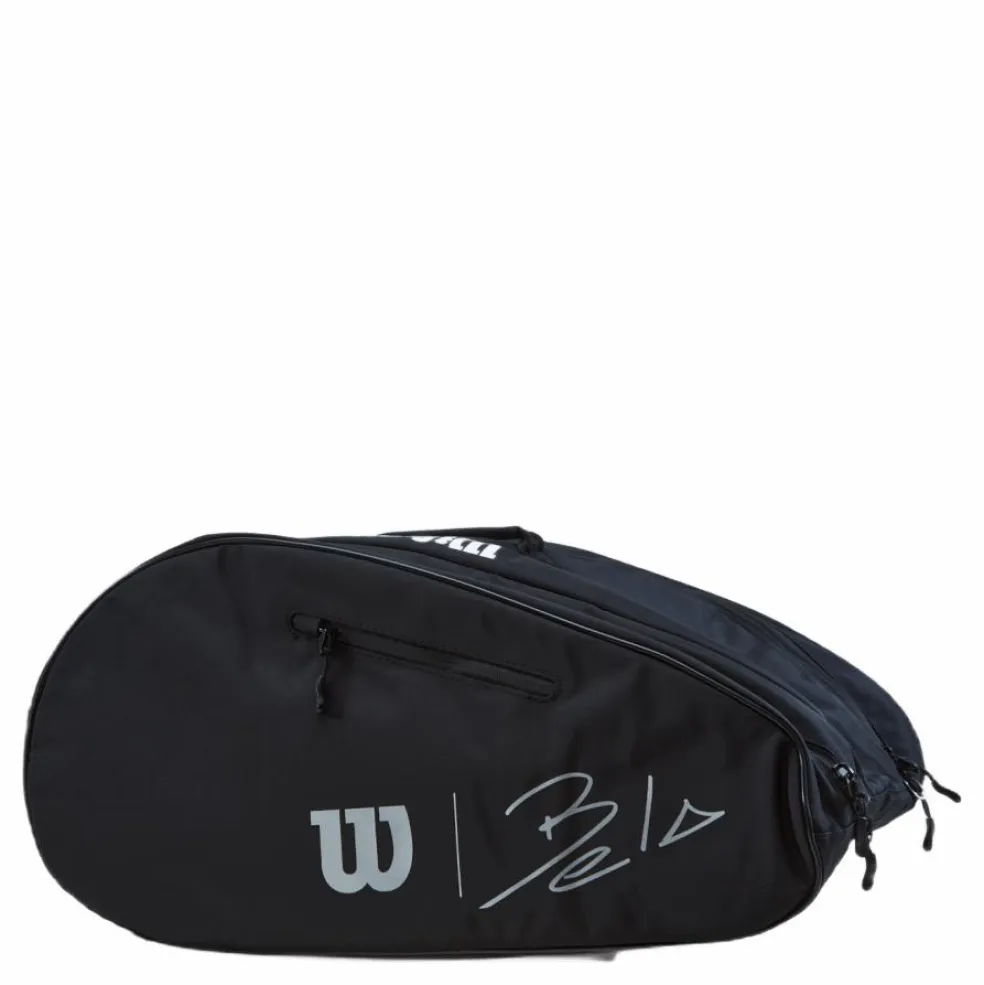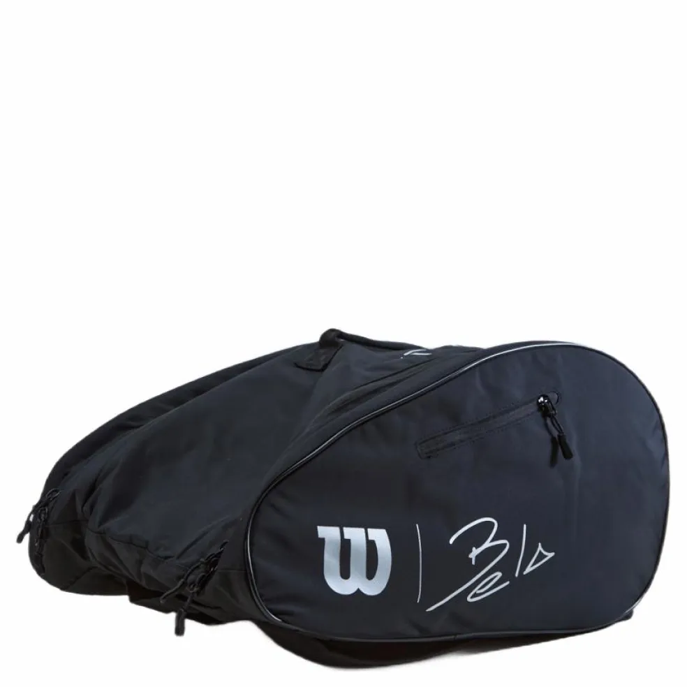 Bär väskan till en padellegend med Bela Super Tour, en väska designad för att ha klassens bästa funktionalitet och utseende. Den här väskan är försedd med Wilson x Bela logotypen mot en ljus infraröd polyester med PU-beläggning för extra hållbarhet och har gott om plats för flera padelrack och extra padelutrustning eller accesssoarer. Med toppfunktioner som inkluderar Thermoguard foder för skydd mot extrem värme, ett fodral för bärbara datorer eller surfplattor och en fleecefodrad tillbehörsficka för mindre värdesaker, är det inte konstigt att detta är valet för en padelfantast.