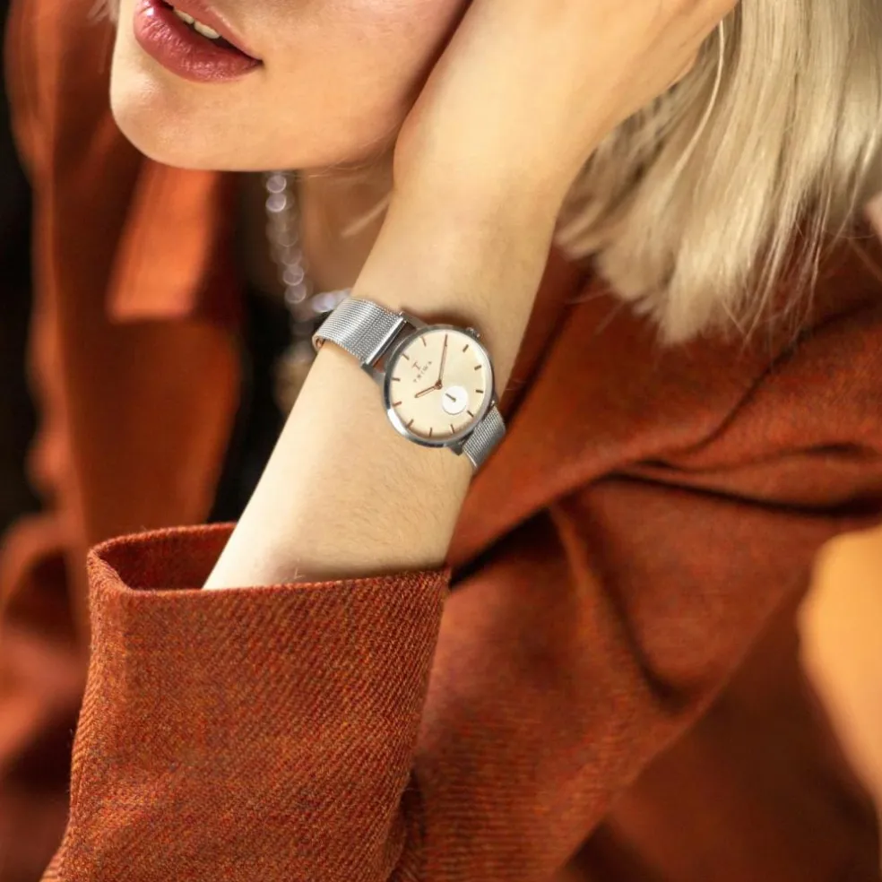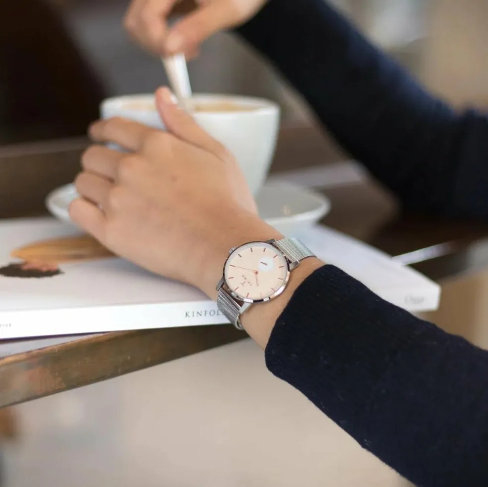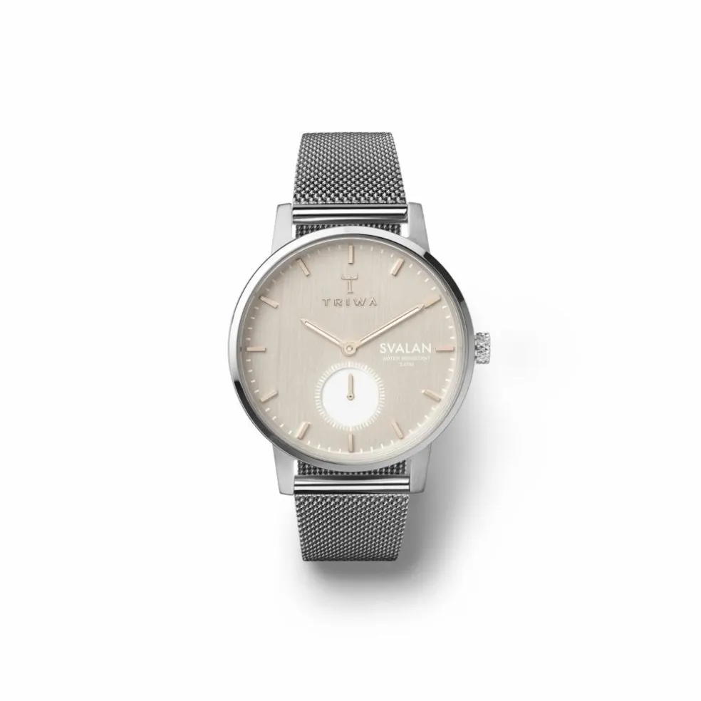 En av Triwas klassiker – Blush Svalan. En klocka i rostfritt stål med en borstad rosafärgad urtavla. Denna lätta och smala klocka är en perfekt vardagsklocka för alla som vill ha en minimalistisk touch på handleden för att komplettera sin outfit.