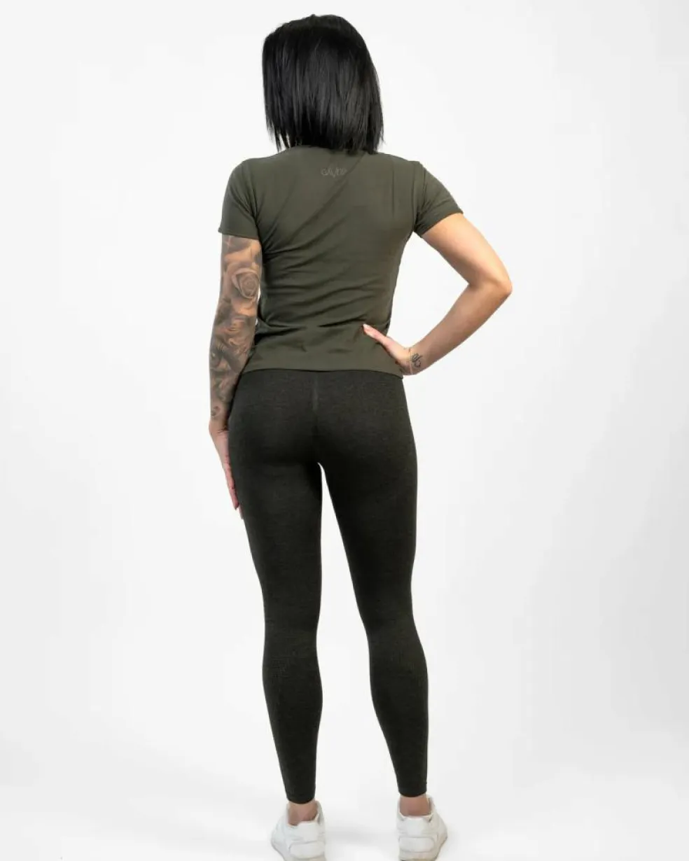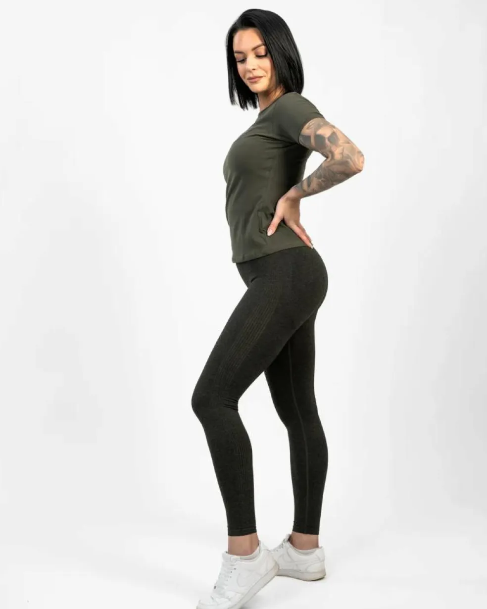 Mjuk och följsam bomulls-T-shirt i en behaglig grönbrun nyans. Tillverkad av 95% ekologisk bomull och 5% elastan för en lätt och luftig känsla. Tunn och stretchig kvalitet. Matcha den med våra snygga sömlösa Booster Melange Peat Tights som visas på bilderna.