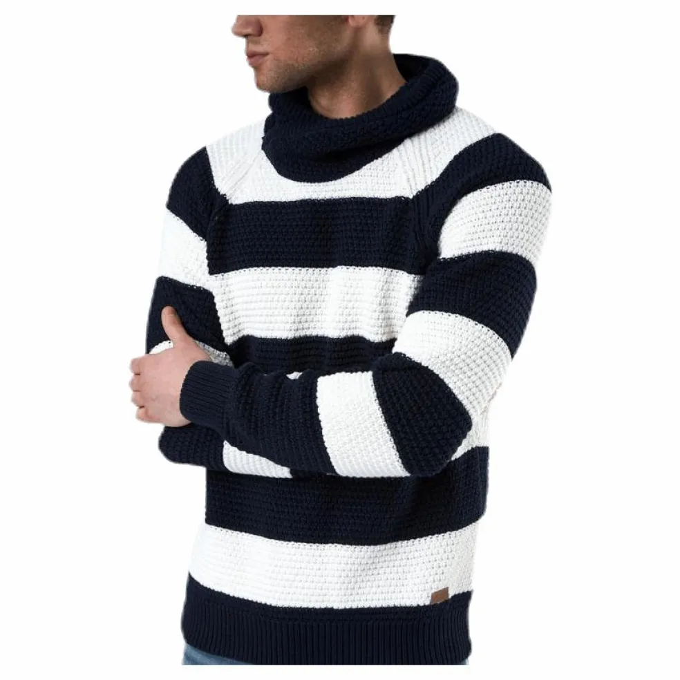 Grovstickad sommartröja i 100% bomull. Klassiska ränder i navy och offwhite. Sjalkrage och raglanärm. Ribbade avslut. 100% bomull. Ribbade muddar. Tillverkad i EU.