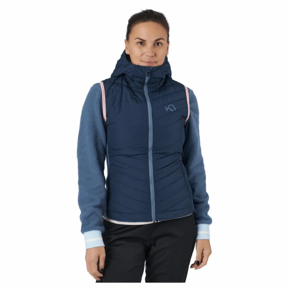 Kari Traa Eva Down Vest är en lätt, vattenavvisande fodrad dunväst med huva för er som vill hålla sig varma i den nordiska naturen. Inga kalla delar: det kraftfulla fodret sitter på plats och läcker inte ut värme. Den smala skärningen och tunna diagonala linjerna med kompakt kviltning gör den perfekt om du vill bära flera lager, och den fasta huvan håller kylan ute. Superrörlig stretch i sidorna gör att den inte glider.