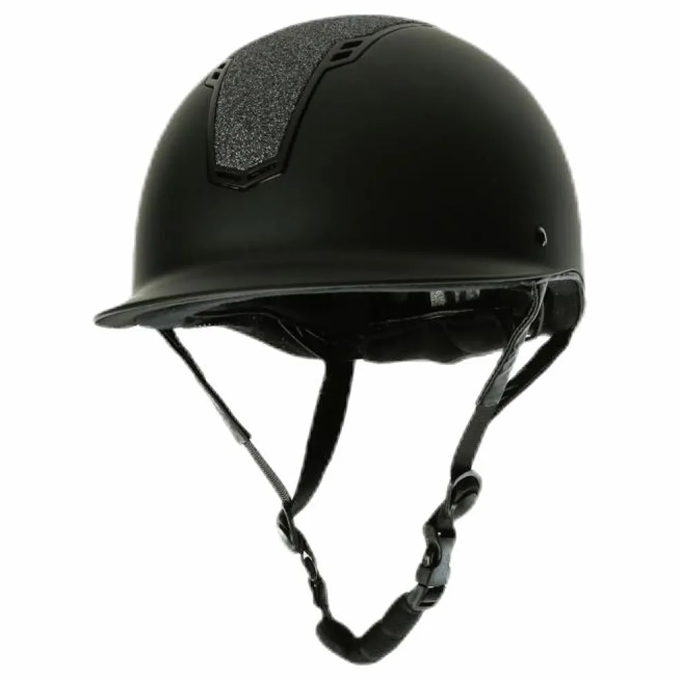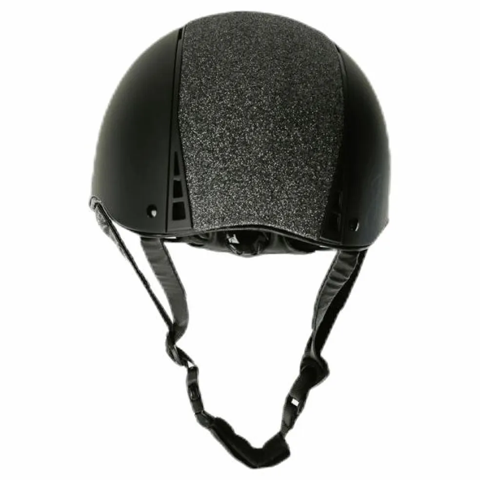 Modern stilren ridhjälm med glitter. VG1 godkänd. Storleken justeras enkelt baktill för optimal passform. Hakbanden täckta med syntetiskt skinn.