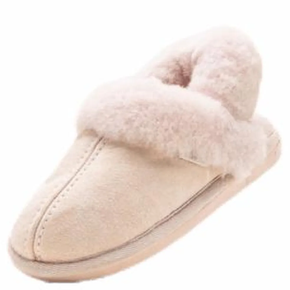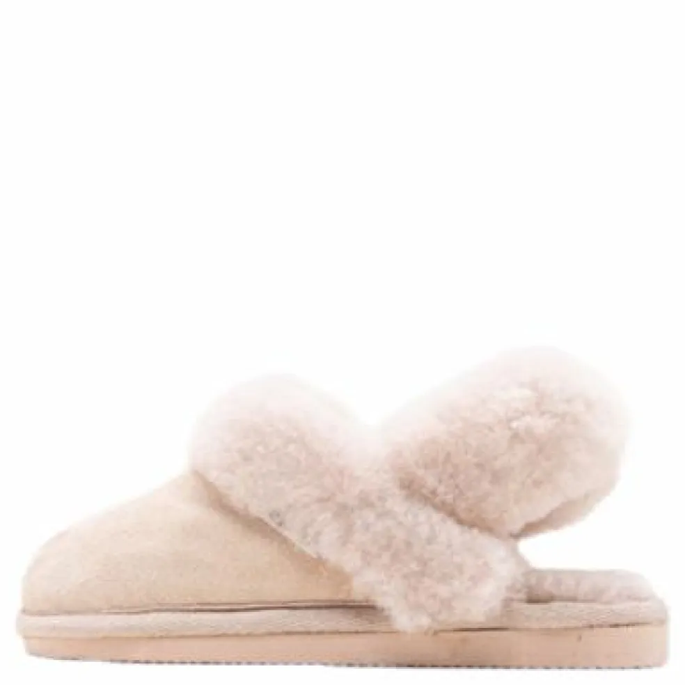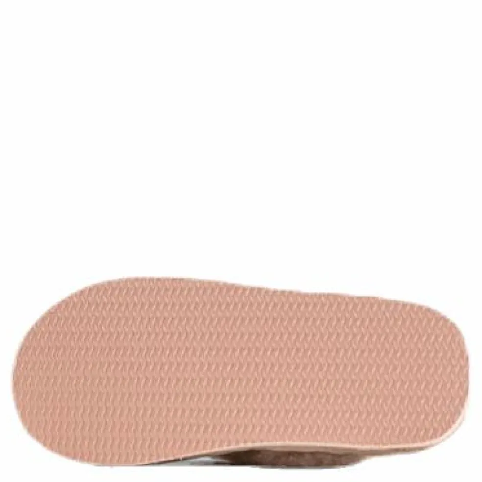 Shepherd Helsingborg. Ett par barntofflor i slip-in modell. Tofflorna har en fårskinnsrem med elastiskt band kring hälen. Kantband i textil runt sulan. Yttersula i EVA.
