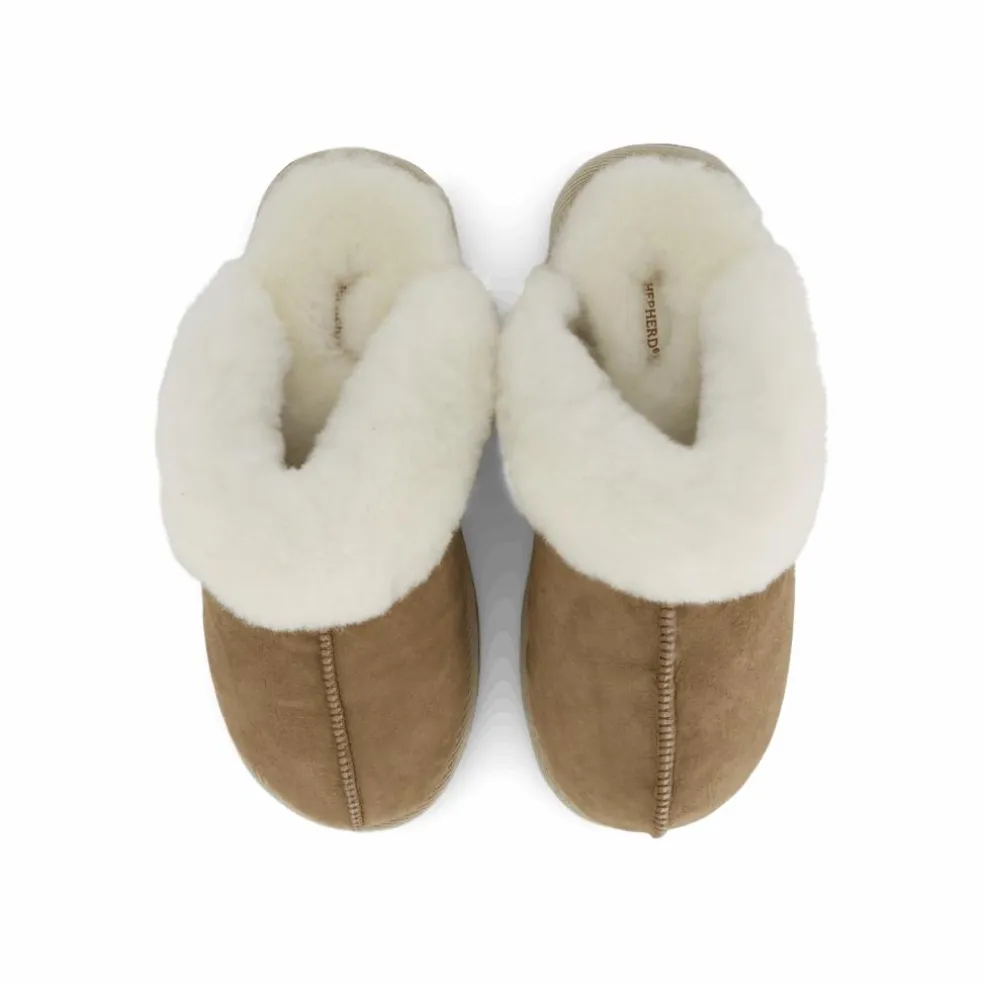 Shepherd Jessica är ett par mjuka och värmande damtofflor i 100% fårskinn. Tofflorna är i slip-in modell med bred fårskinnskrage och en dekorativ yta framtill. Textilkant runt sulan. Yttersula i EVA