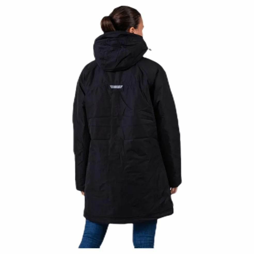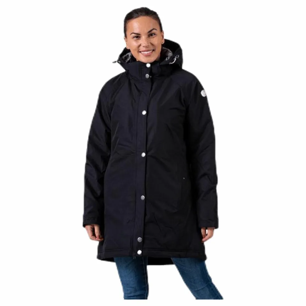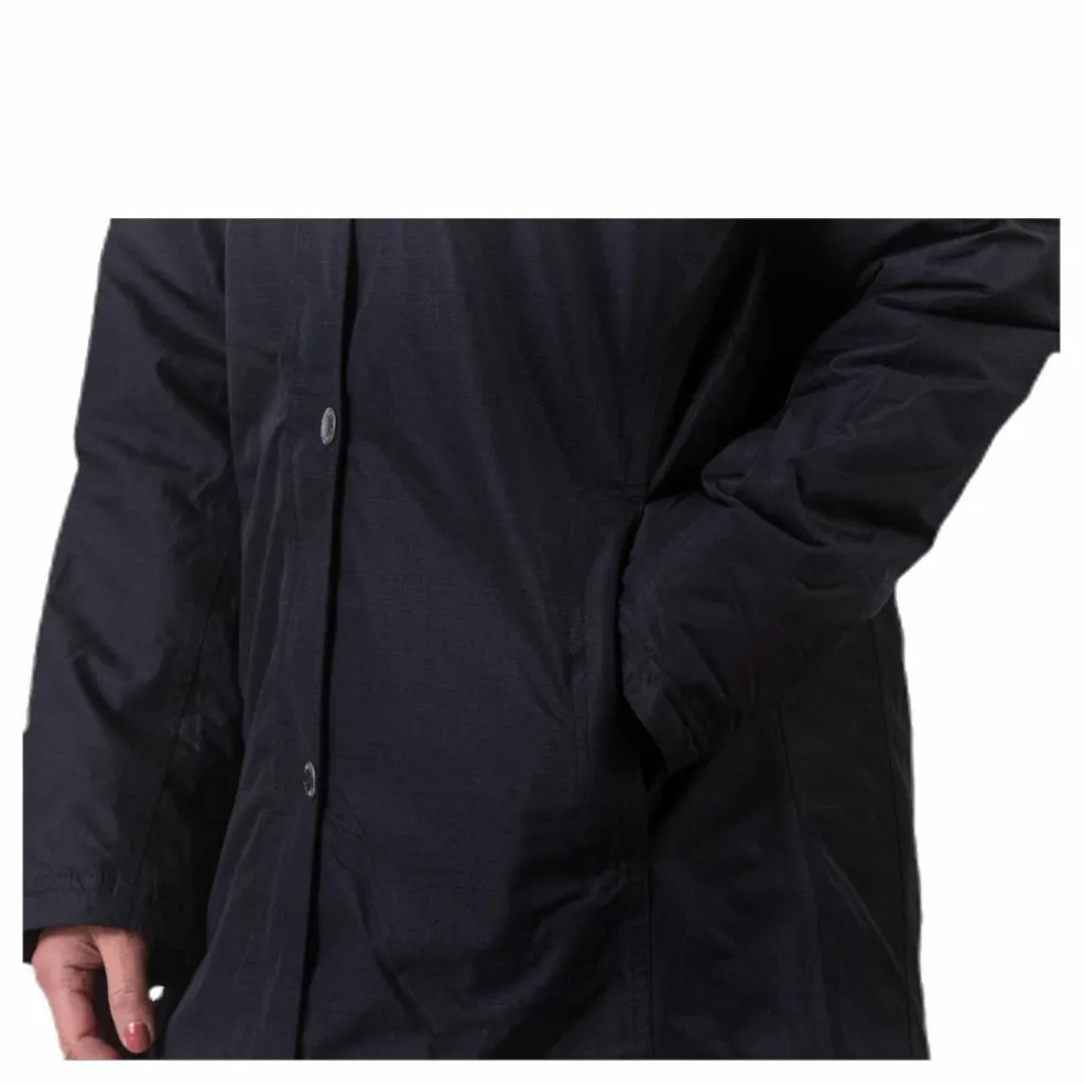 Vatten-och vindtät, lättvaddad damjacka i swaggermodell. Avtagbar huva, mudd i ärmavslut. 2 fickor i sidorna samt en på insidan. 2-vägsblixtlås i fronten. Lätt och smidigt material som har ett laminat för att behålla vattentätheten. Tejpade sömmar. 8000 mm vattenpelare och 5000 gr/24h/m2 andningsbarhet. 100% Polyester.