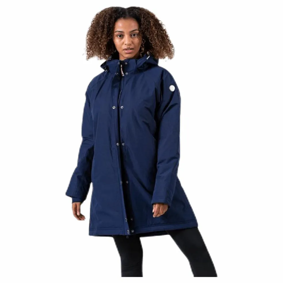 Vatten-och vindtät, lättvaddad damjacka i swaggermodell. Avtagbar huva, mudd i ärmavslut. 2 fickor i sidorna samt en på insidan. 2-vägsblixtlås i fronten. Lätt och smidigt material som har ett laminat för att behålla vattentätheten. Tejpade sömmar. 8000 mm vattenpelare och 5000 gr/24h/m2 andningsbarhet. 100% Polyester.