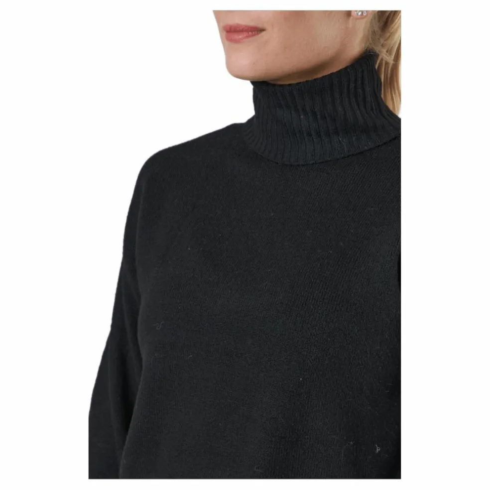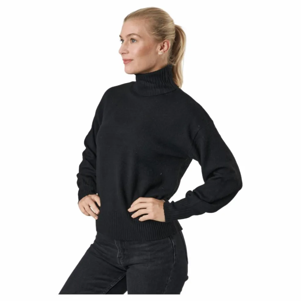 Bli en stilikon med denna eleganta svarta tröja. Den har en hög halsringning och skulpterad nederkant, perfekt för lager eller att bära ensam. Tyget är en blandning av polyester och elastan, vilket gör det stretchigt, andningsbart och bekvämt att bära.