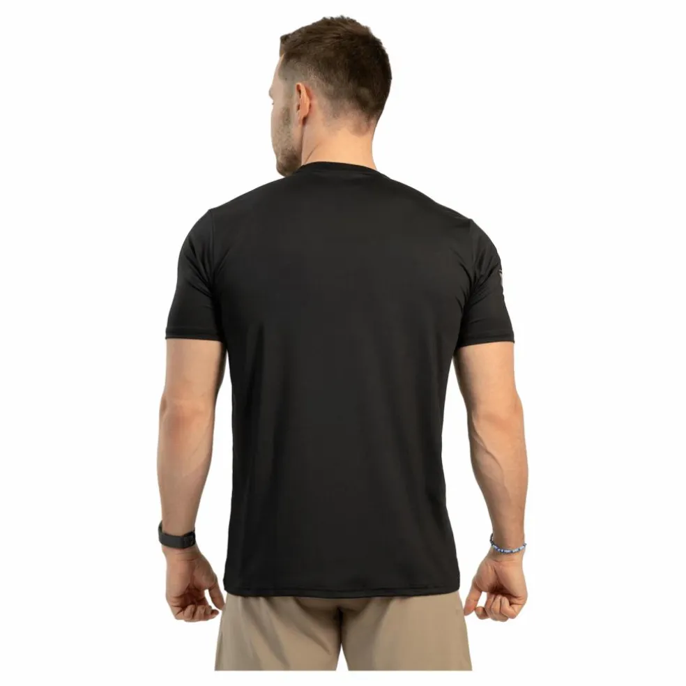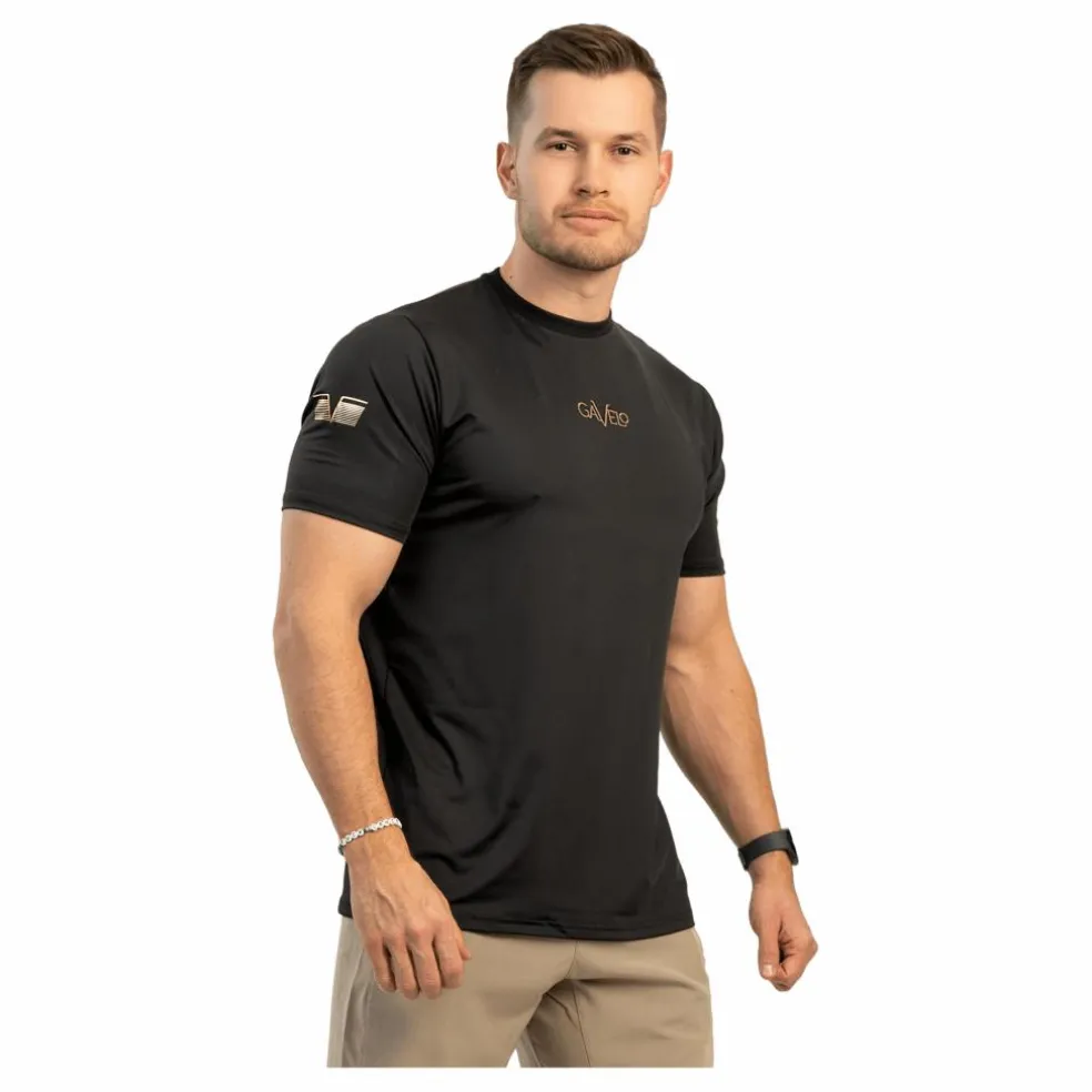 Svart Rashguard med guld Gavelo logotyp, tillverkad av högkvalitativt funktionsmaterial. Designad för att hålla dig sval och torr under intensiv träning, den erbjuder en smickrande siluett och optimal rörelsefrihet.