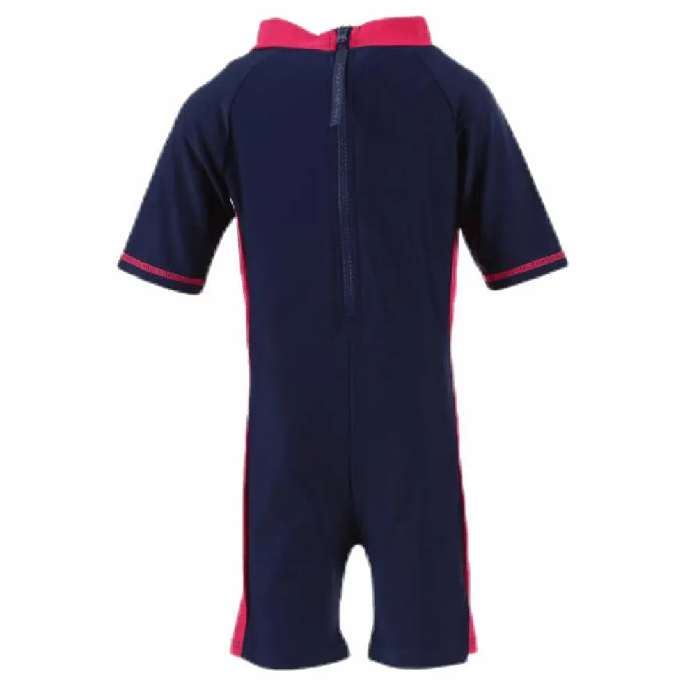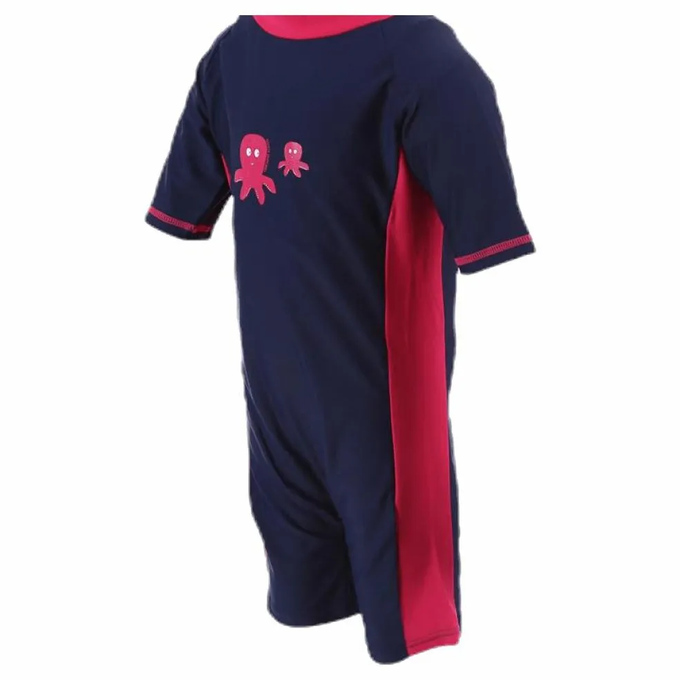 2-färgad barn UV dräkt med skyddsfaktor 50 med lekfullt tryck av en bläckfisk fram. Dragkedja med sprund bak med marinblå logoflik. 80% Polyamide 20% Elastane. UV UPF 50+.