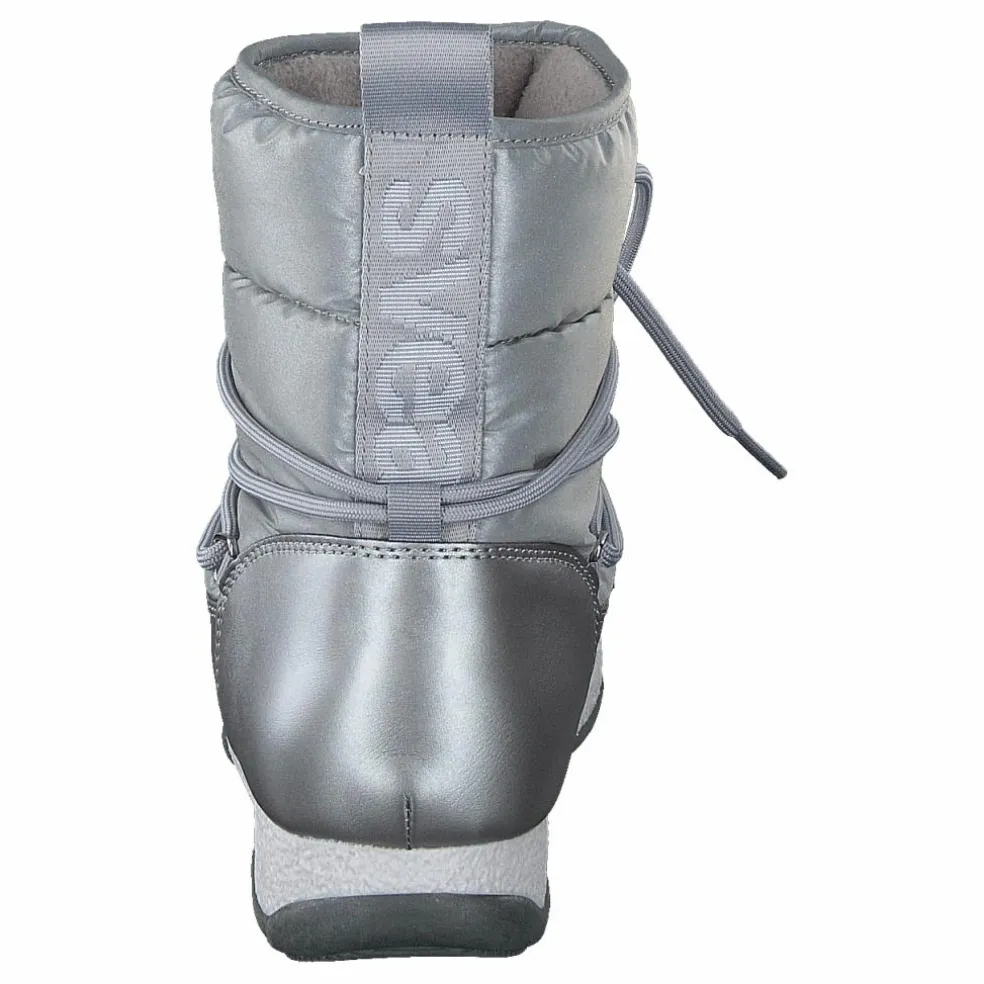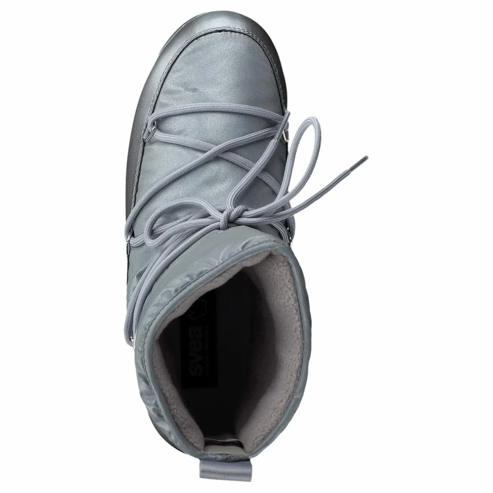 Fluffiga och varma stövlar i nylon som är vattentäta och ankellånga. Skaftet avslutas med bandkant i resår. Har en platt och grov gummisula och tjock dekorativ snörning framtill. Perfekt för kalla höst- och vinterdagar. På baksidan finns ett svea logoband.