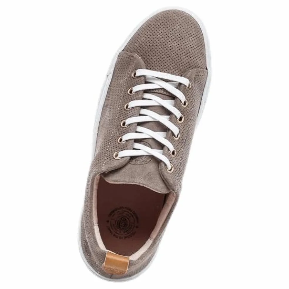 Stoked low är en clean sneaker i perforerad mocka med en naturfärgad läderstrap mitt bak. Foder och innersula i microfiber för bra komfort. Sulan är i gummi, och sydd på ett sätt som gör den extra flexibel och bekväm.