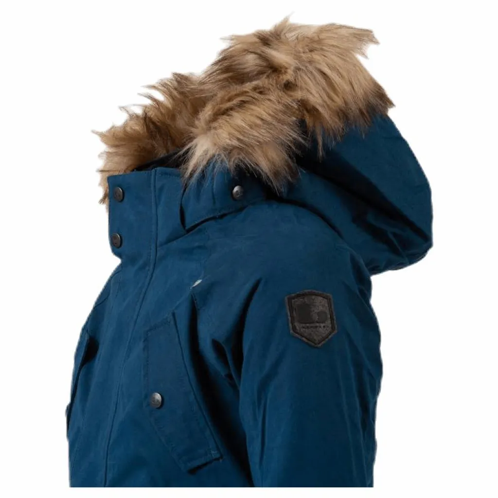 Lindbergparkas som är tillverkad i bomullsblandad nylon. Tyget är vattentätt 5.000 mm (ej tejpade sömmar). Jackan har en mjuk stoppning och är fleecefodrad i ryggen. Huvan är justerbar och avtagbar med en fuskpälskant. Två sidofickor och två fakefickor på bröstet. Flourkarbonfri.
