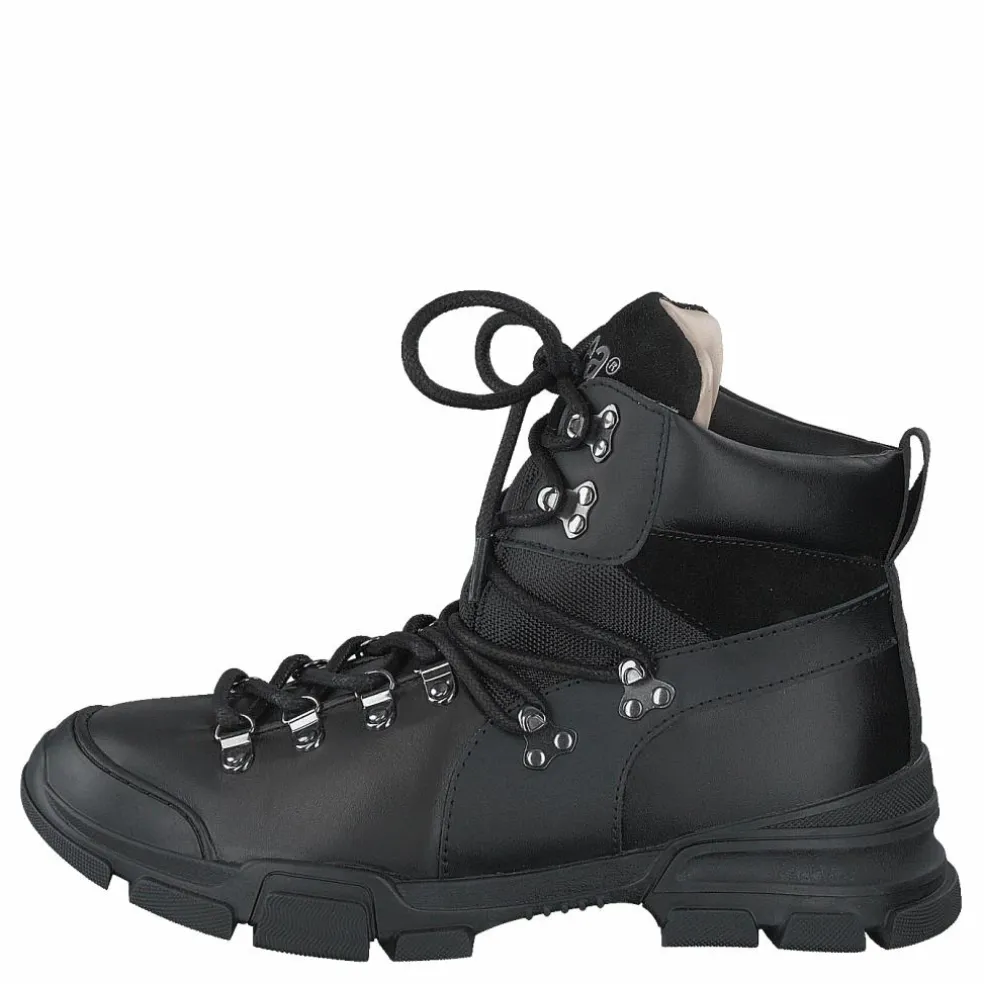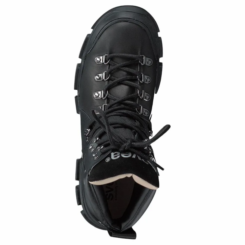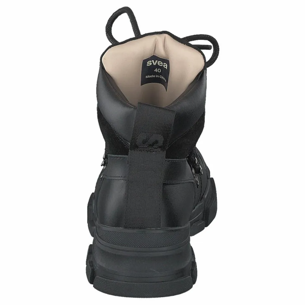 Tracking boots med rundad tå och fotled. Har en stadig och mönstrad yttersula i gummi. Tjock snörning fram med öljetter, som går hela vägen upp. Har svea logoband baktill och reflekterande svea logotyptryck på plösen i 3D-effekt.
