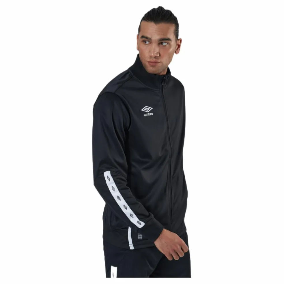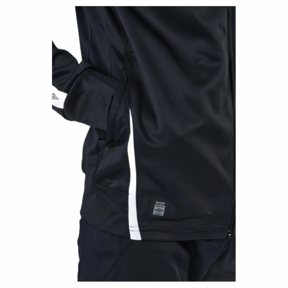 Umbro UX Elite Track Jacket för män är ett bra stycke funktionella fritidskläder. Med en konstruktion av bomullsjersey ger denna jacka komfort och värme, vilket gör den perfekt för dagligt bruk. En ribbstickad halsringning och muddar ger obegränsad rörelse medan dragsko håller jackan på plats. Utrustad med två framfickor och en bröstficka med dragkedja, är denna jacka också idealisk för att hålla dina tillhörigheter säkra.