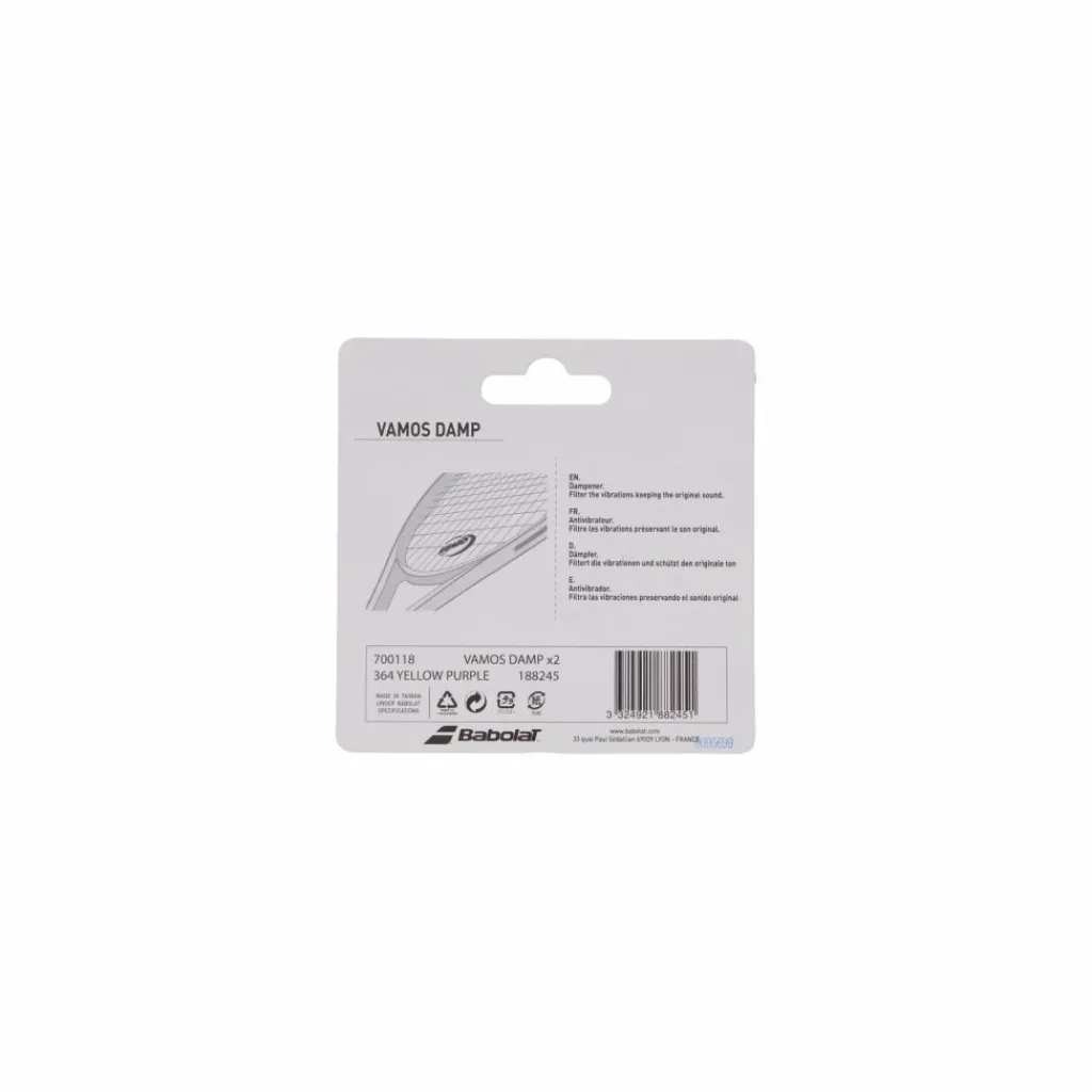 Kontrollera vibrationer och förbättra ditt grepp med Babolat Vamos Damp X2 Rafa. Dessa dämpare är designade för att förbättra din komfort och minska vibrationer under dina tennismatcher, samtidigt som de hyllar den legendariska Rafa Nadal.