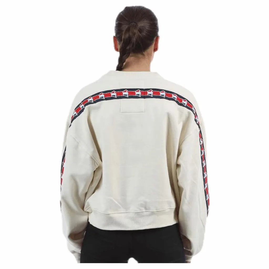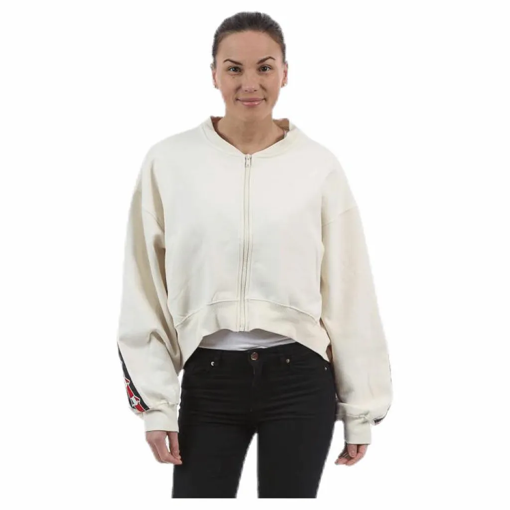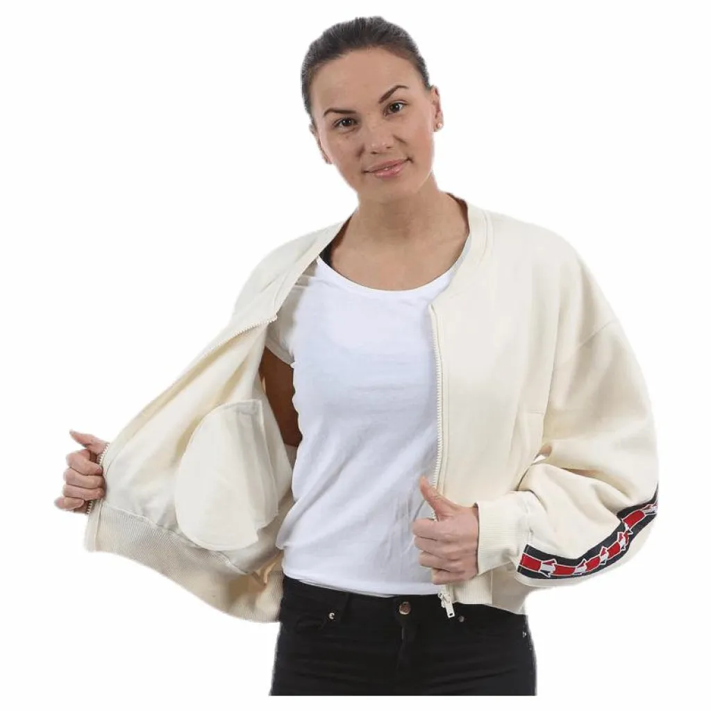 Tröja i en kortare modell som också är en aningen kortare framtill. Tröjan försluts med dragkedja och har två ckor på vardera sida om dragkedjeknäppningen. Ribbstickad krage. nederkant samt ribbstickade muddar i ärmslut. Påsytt sveaband med sveakronan som går längst sidsömmen på ärmarna och över ryggen.