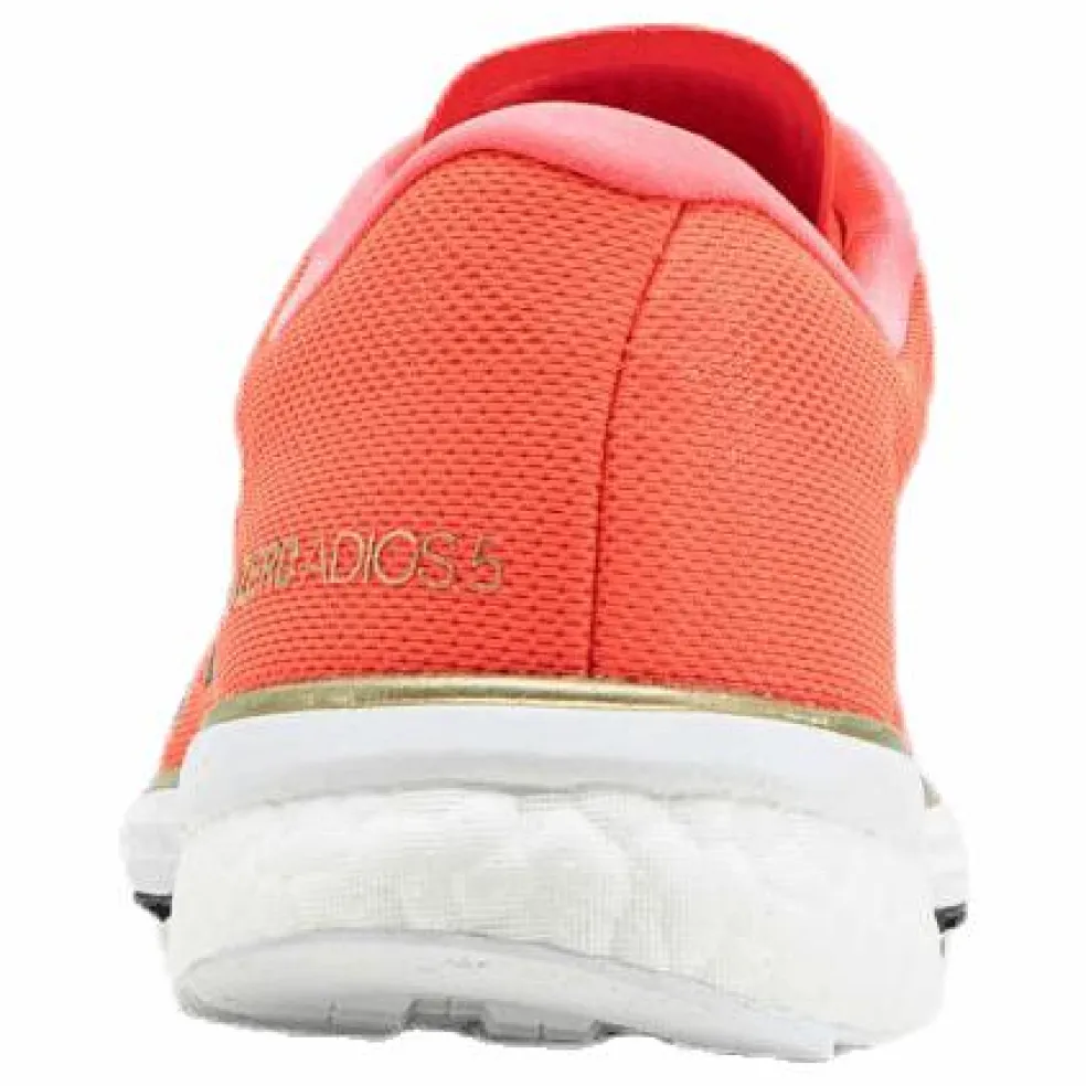 Vem har sagt att löpningen måste vara lång och gå i sakta mak? Det är dags att ändra på narrativet med hjälp av dessa lätta löparskor skapade för ett snabbare tempo. Skorna Adizero Adios 5 är skapade för komfort genom löpningen, med en fjädrande mellansula och superlätt ovandel för att hålla ett jämnt tempo även när du börjar bli trött. Rosa detaljer representerar sammanhållning och en global uppmaning till förändring. Vikt: 224 g (storlek 42 2/3). Mellansulans dropp: 9,5 mm (häl: 21,5 mm, framfot: 12 mm). Yttersula i gummit Continental™. Knyts med snören. Meshovandel. Lightstrike-dämpning för snabb och smidig känsla. Lätta löparskor. Responsiv mellansula med Boost.