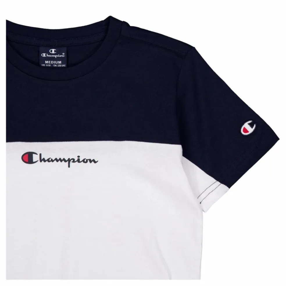Uppdatera din lilla trendsättares fritidskläder med denna Champion tvåfärgade t-shirt, med våra signaturlogodetaljer. Perfekt för hans dagliga äventyr!