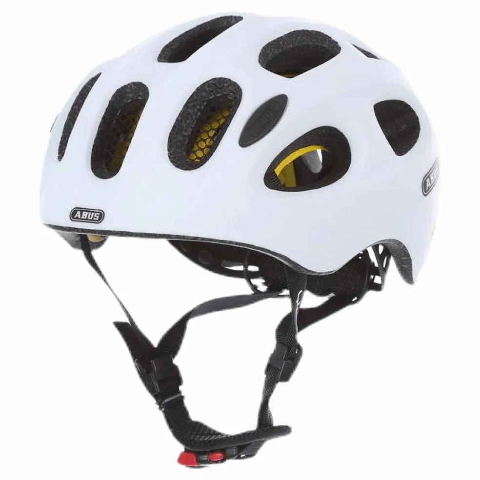 Abus Youn-I • In-Mold och det stötdämpande hjälmmaterialet EPS • ZoomLite – exakt justering • Integrerat LED-ljus i hjälmen för extra synlighet/säkerhet i mörker • Mycket bra ventilation med 5 luftintag och 12 utlopp • Avtagbar och tvättbar stoppning med maximal komfort Vikt: S 240 g, M 260 gStorlek S: 48-54 cmStorlek M: 52-57 cm