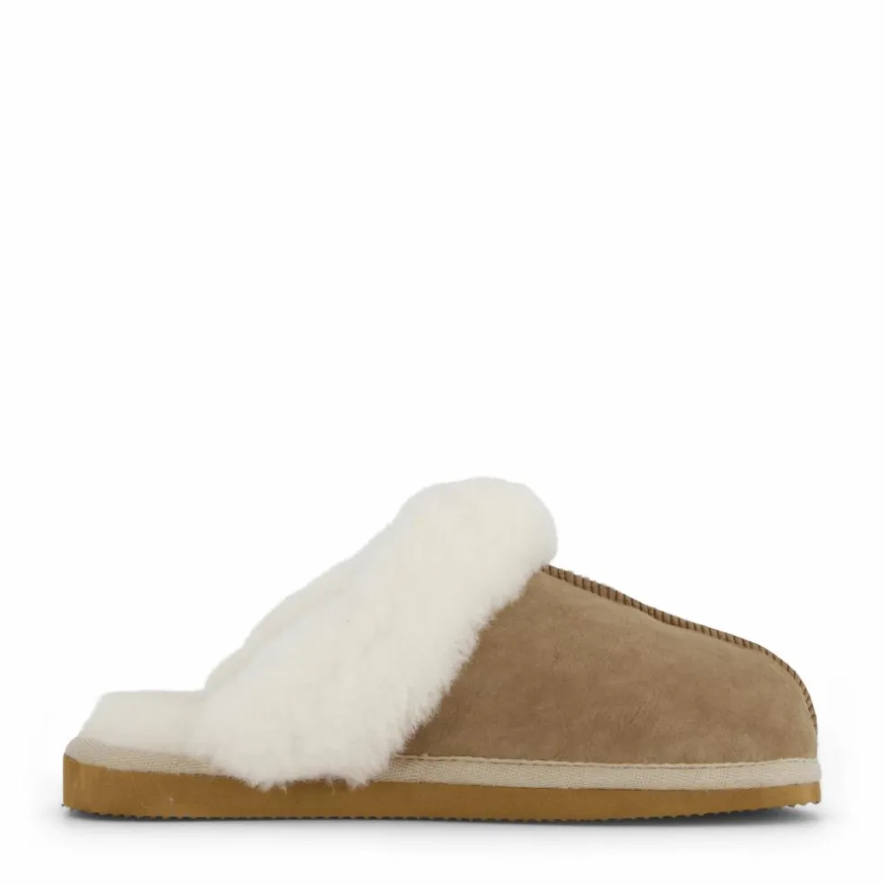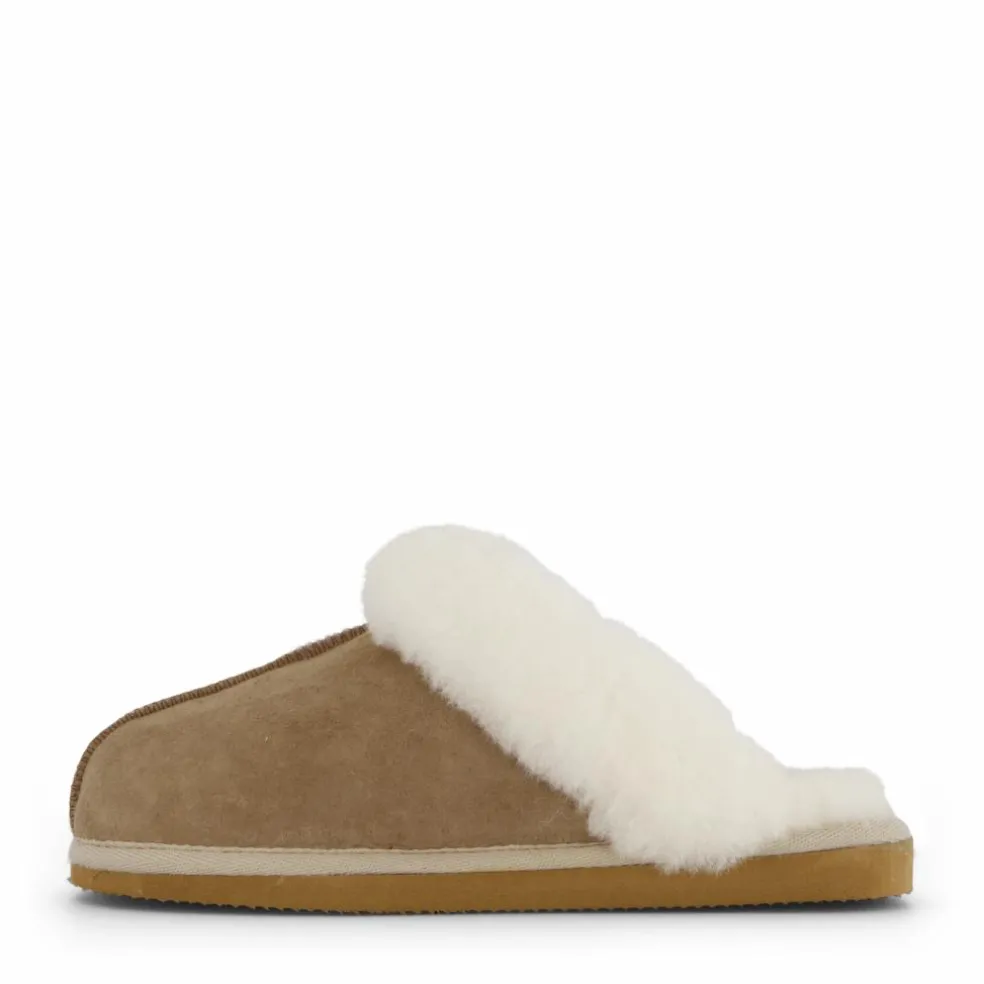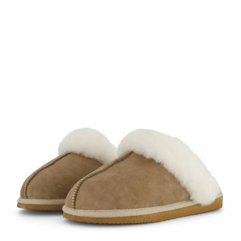 Shepherd Jessica är ett par mjuka och värmande damtofflor i 100% fårskinn. Tofflorna är i slip-in modell med bred fårskinnskrage och en dekorativ yta framtill. Textilkant runt sulan. Yttersula i EVA