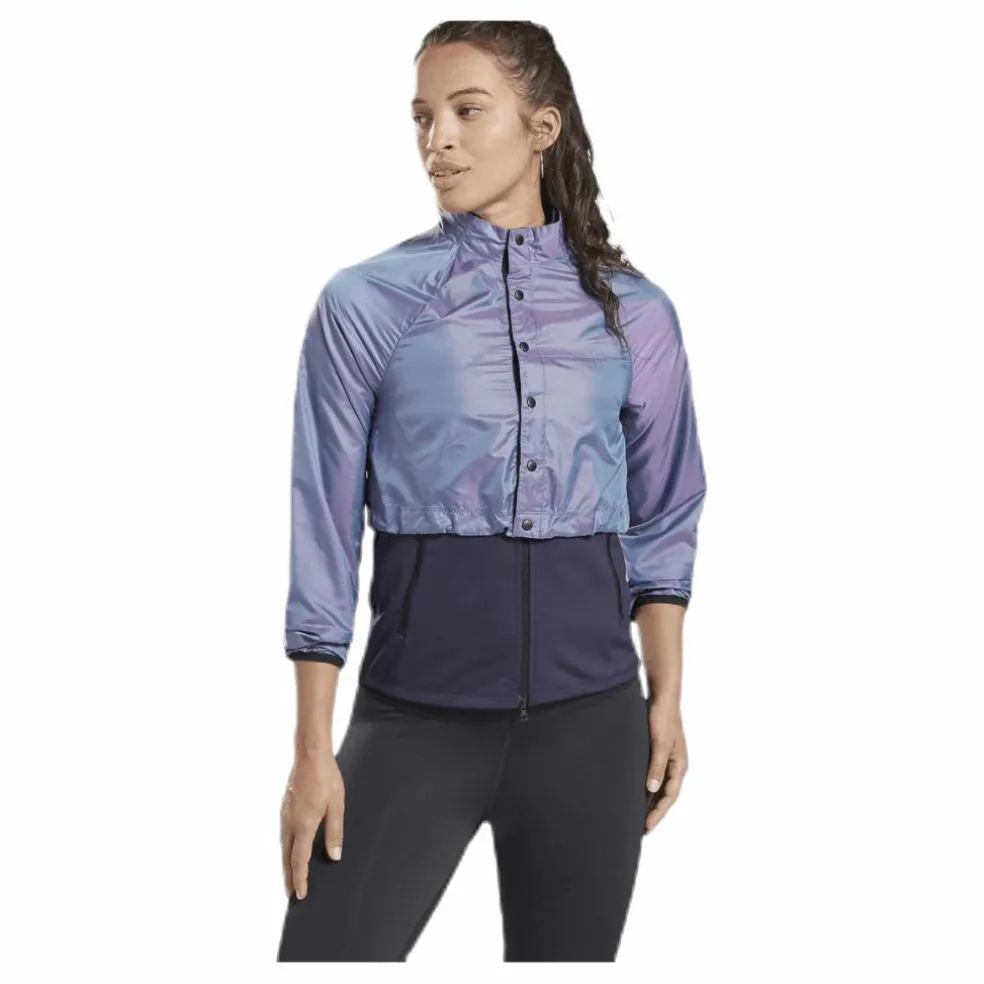 När vädret är osäkert ger denna löparjacka för dam en paketerbar försäkring. Den är gjord av regnbågsskimrande polyester som stöter bort regn och snö. Den åtsittande jackan har ett övre lager med tryckknappar och ett undre lager med dragkedja.