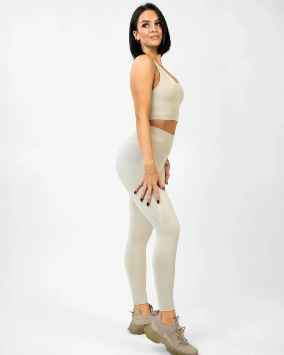 Elegant stil: Den beigea nyansen, inspirerad av solens strålar som reflekteras på vattenytan, skapar en elegant och energigivande look som enkelt matchar din träningsgarderob.