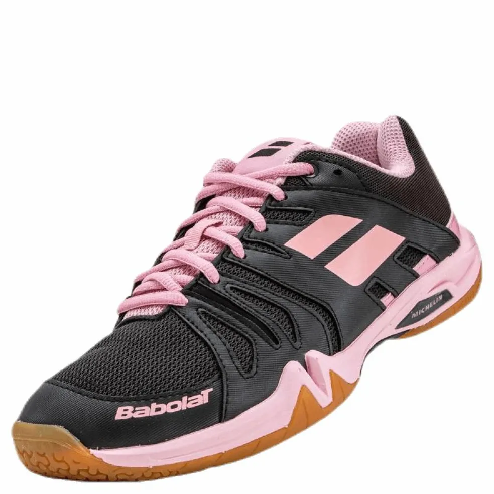 Dam-sko från Babolat som är en storsäljare bland motionärer som söker en indoor-sko som passar till många olika sporter. Precis som alla skomodeller från Babolat så är undersulan tillverkad av däckspecialisten Michelin för ett perfekt grepp och bra hållbarhet. Ordentligt dämpad i hälen för att minimera stötar och ökad komfort i skon. Ovansidan är tillverkad med slitstarkt mesh-material med god andningsförmåga som leder bort svett från foten. Skon har en väldigt lätt vikt och är därmed mycket smidig och för att snabba upp fotarbetet. Hälkappan är förstärkt och något högre än standard för att garantera bra support och stabilitet.