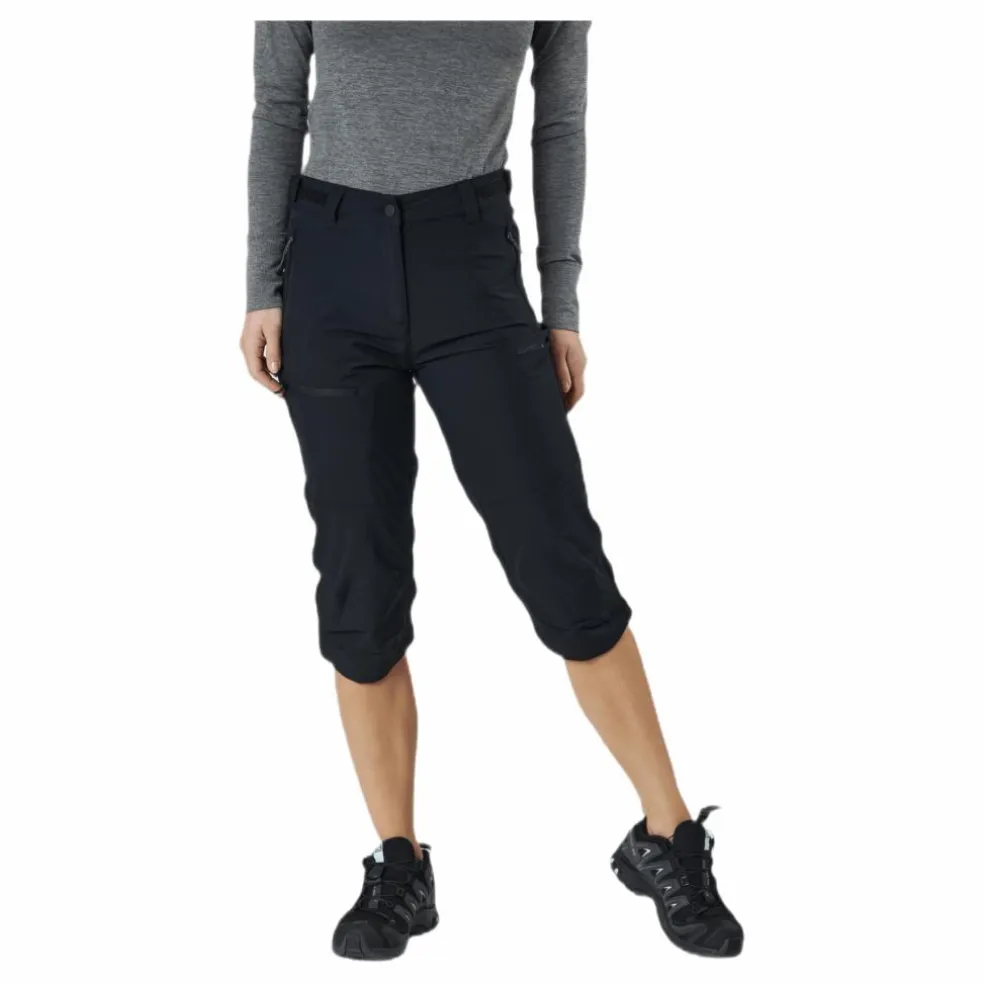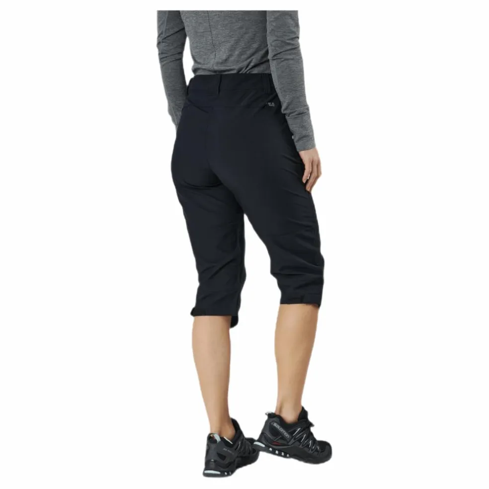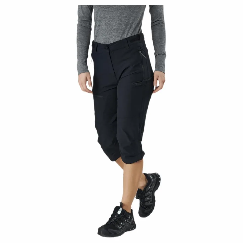 Capribyxa i light två-vägs stretchmaterial gör byxan lätt o smidig. Vind- och vattenavvisande, QuickDrybehandlad med en coating som får tyget att torka snabbt och även hålla borta smutsen. Justerbar i midja och vid knä. 90% polyester 10% elastan.