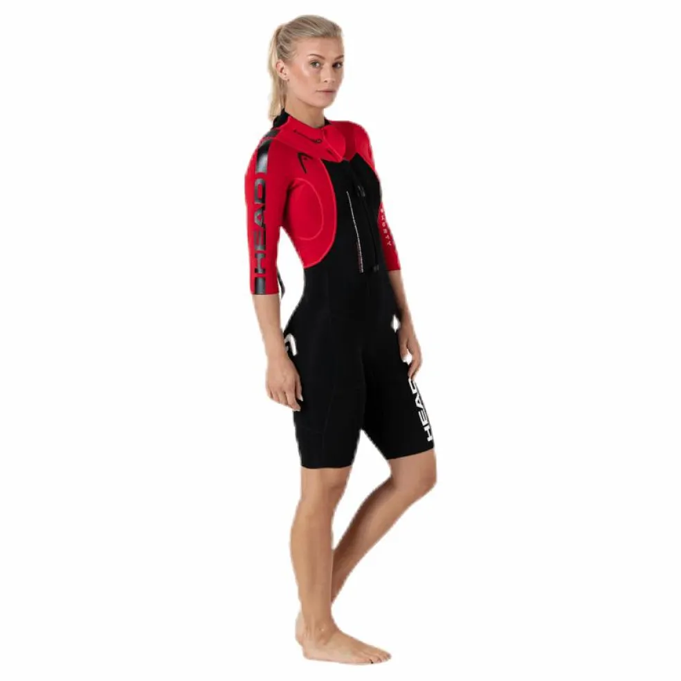 Swimrun Rough Shorty – kort swimrundräkt för både träning och tävling. Dräkten är tillverkad i ett tunnt och flexibelt 2mm neopren som är nylonbeklätt på både insida och utsida vilket gör den mycket slitstark. Röda ärmar och rygg för ökad synlighet framförallt i vattnet. Fri rörlighet i höftpartiet vilket underlättar löpningen. 3mm paneler över bröst och lår för ökad flytkraft. Dragkedja både fram och bak för att enkelt kunna ”cabba ner” under löpning. Två lätt tillgängliga innerfickor för ex. energi eller gps sändare. Nylonöglor fram och bak för att enkelt kunna fästa parlina eller tillbehör. En minimal men effektiv visselpipa är fäst på dragkedjan fram. Dräkten kommer med korta ben och 3/4 ärmlängd. Finns i både dam och herrmodeller.