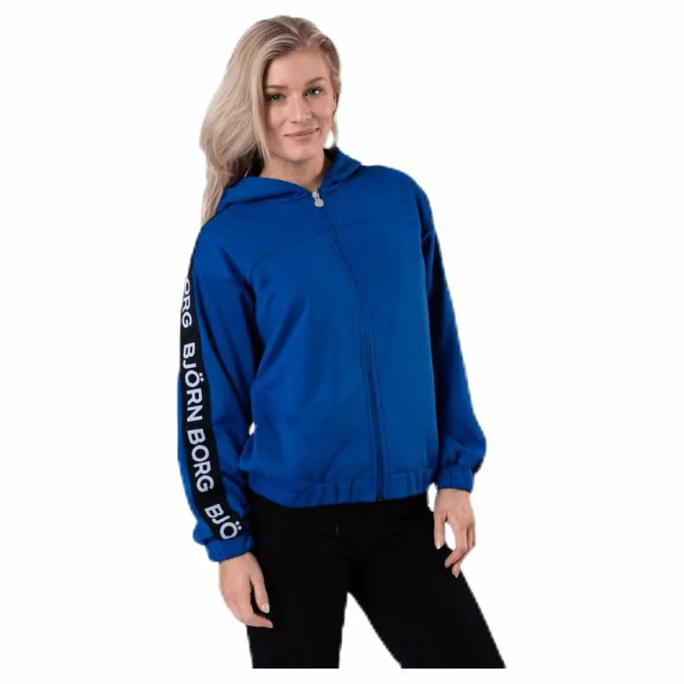 Säsongens Team Borg Women Vct Jacket kommer i knalligt blå och klassiskt svart, med band med Borg-tryck på ärmarna. Midja och ärmslut är bekvämt elastiska. Jackan har luva och är tillverkad i 100% polyester och med blixtås fram.