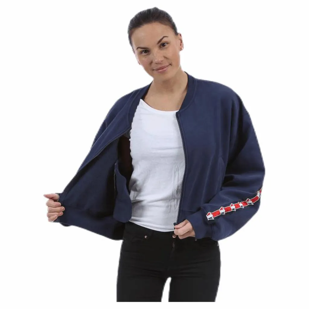 Tröja i en kortare modell som också är en aningen kortare framtill. Tröjan försluts med dragkedja och har två ckor på vardera sida om dragkedjeknäppningen. Ribbstickad krage. nederkant samt ribbstickade muddar i ärmslut. Påsytt sveaband med sveakronan som går längst sidsömmen på ärmarna och över ryggen.